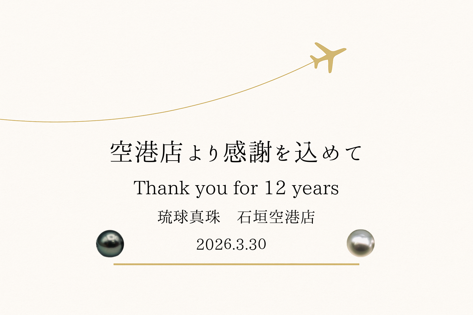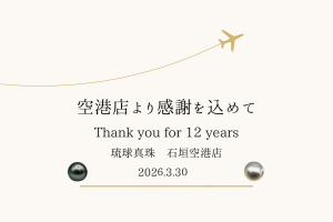 琉球真珠石垣空港店は、2013年3月7日の新石垣空港開港以来、12年間にわたり営業を続けてまいりましたが、2026年3月30日をもちまして閉店 する運びとなりました。