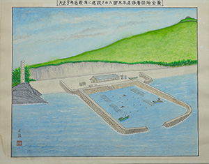 大田正議氏作『大正3年名蔵湾に建設された御木本真珠養殖場全景』(琉球真珠所蔵)