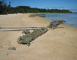 名蔵湾の御木本真珠養殖場では、沖に向かって石積みの堤防を築き、その堤防内の海底で真珠母貝を養殖しました。そこで潜水作業をしていたのは三重県から来た海女たちで、石垣島の人々はその姿を物珍しそうに眺めたそうです。