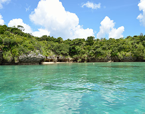 創業初期の挿核手術室があった川平湾に浮かぶ小島・婿離(むこばなれ)