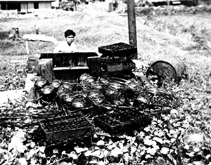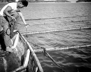 養殖筏は破壊され、針金製の養殖カゴは曲がり、手術貝は海底に散逸するなど、甚大な被害を受けます。全壊した養殖施設を補修する資金にも事欠くため、渡嘉敷らは孟宗竹製の筏を作り替えるために於茂登岳山中からリュウキュウチクを刈り出し、筏のアンカーロープにはクロツグというヤシ科の植物で編んだ縄を代用するなどして復旧作業にあたります。
