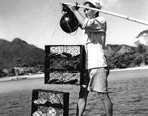 川平湾で再び真珠養殖 琉球真珠元会長の渡嘉敷進(1924〜2018)は、1924年(大正13年)12月に台湾台南州で生まれ、5歳の時、父親の死去に伴い故郷の石垣島に引き揚げます。地元の尋常小学校を卒業後、再び台湾へ渡り、台湾総督府水産講習所の養殖科で学びます。当時の渡嘉敷は、夏休みに石垣島へ帰省すると、毎日のように川平湾の御木本真珠養殖場を訪れ、黒蝶真珠養殖に強い憧れを抱くようになります。