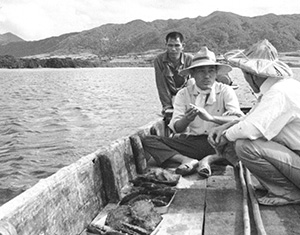 船上で中村俊夫氏と話す渡嘉敷進(後方は南風野喜孝)