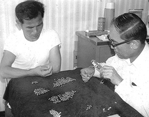 1964年(昭和39年)5月から1966年(昭和41年)9月にかけて、御木本真珠から技術者がのべ8名来島します。当社からは渡嘉敷進、南風野喜孝とともに仲野英則(現顧問)が技術陣に加わります。