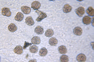 受精卵の大きさは約50ミクロン(0.05mm)で、受精すると水槽の底に沈殿していきます。