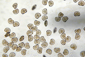 7~10日後にはD型幼生の殻頂部(ちょうつがい)が突出してハマグリ型になると、アンボ期幼生と呼ばれるようになります。大きさは130ミクロン(0.13mm)~150ミクロン(0.15mm)です。