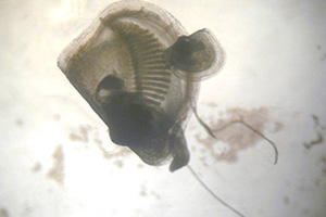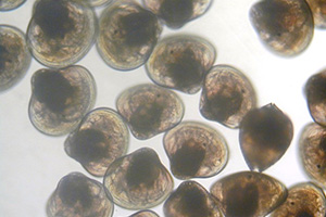 受精後約20時間でD字状の貝殻をもつD型幼生になります。初期D型幼生の大きさは約85ミクロン(0.085mm)で、水槽内を活発に泳ぎまわり餌を食べ始めます。
