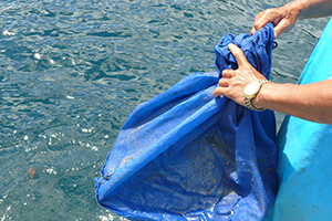 プラスチックカゴが入ったネットを海中に吊り下げ、稚貝を海に戻します。