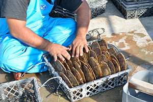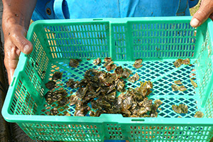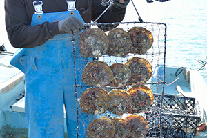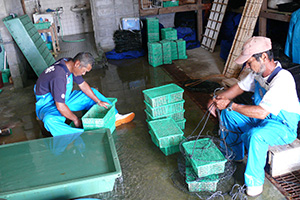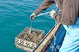 受精後60~70日で付着稚貝が2~3㎜に成長すると、飼育室の水槽から目の細かいカゴへ収容し、養殖いかだに吊り下げて自然の海へ沖出しします。