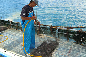 稚貝はお互いにくっつきあい団子状になる性質があります。そのため定期的に切り離す作業を行うとともに、稚貝の成長を妨げる付着物をひとつひとつ手作業で取り除いていきます。