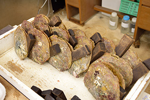 脱核調査では、手術貝に核が留まっているかどうかを調べます。順調に貝の生殖巣に核が留まっていれば本活(ほんいけ)養殖へ、核が抜け落ちた脱核貝は再手術のために養生されます。なお、核が留まっている貝は「クロガイ(玄貝)」と呼ばれます。