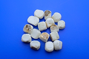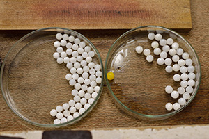 研磨機で丸く加工し、白くて真円のものを選別します。