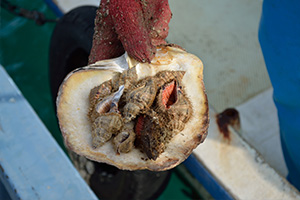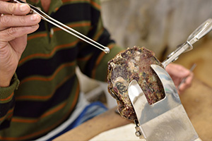 いよいよ真珠の収穫、浜揚げです。挿核手術から2年養殖した母貝を陸揚げし、挿核の時と同じように開口器でひとつひとつ貝を開けながら、切開した生殖巣から真珠を取り出します。