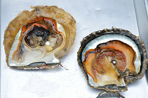 わかりやすく貝を割ってみました。生殖巣にメスを入れると、美しい真珠が姿をあらわします。