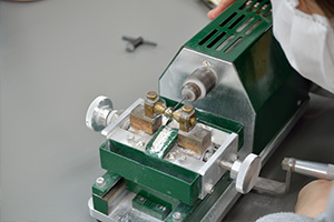 ドリルを使って真珠に穴をあける加工作業