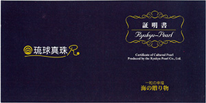 - 琉球真珠の黒蝶真珠と白蝶真珠は、当社の厳しい品質基準をクリアした真珠のみを製品としてお届けしております。原則として鑑別書はお付けしませんが、ご購入時に証明書をお渡しします。証明書は、アフターケアの際に保証書の代わりとなりますので、大切に保管してください。