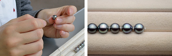 ワイヤー糸は、黒蝶真珠や白蝶真珠のような大きなサイズの真珠に対しても耐久性があり、絹糸のように切れたり、ゆるんだりすることが少ない素材です。ですが、二つ折りにするとワイヤーが折れることもございます。
