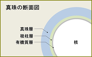 真珠層は、肉眼では見えない厚さ約0.3ミクロン(0.0003mm)の結晶層が数千層も積み重なることで、表面だけでなく内側から真珠の輝きを生み出します。